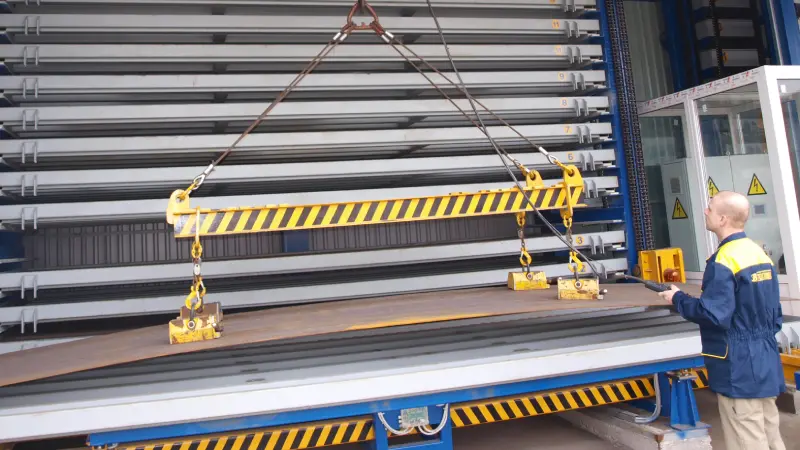 Cross transport – moves beams, round rolled products, and other elements from the storage area to the roller conveyor and back.