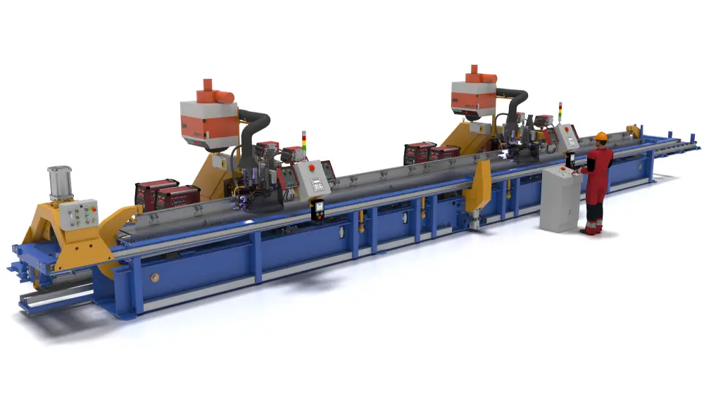 - Centering and Tack Welding. The trolley moves along the stand, performing precise centering and vertical clamping of the I-beam. A following welding unit performs tack welds.