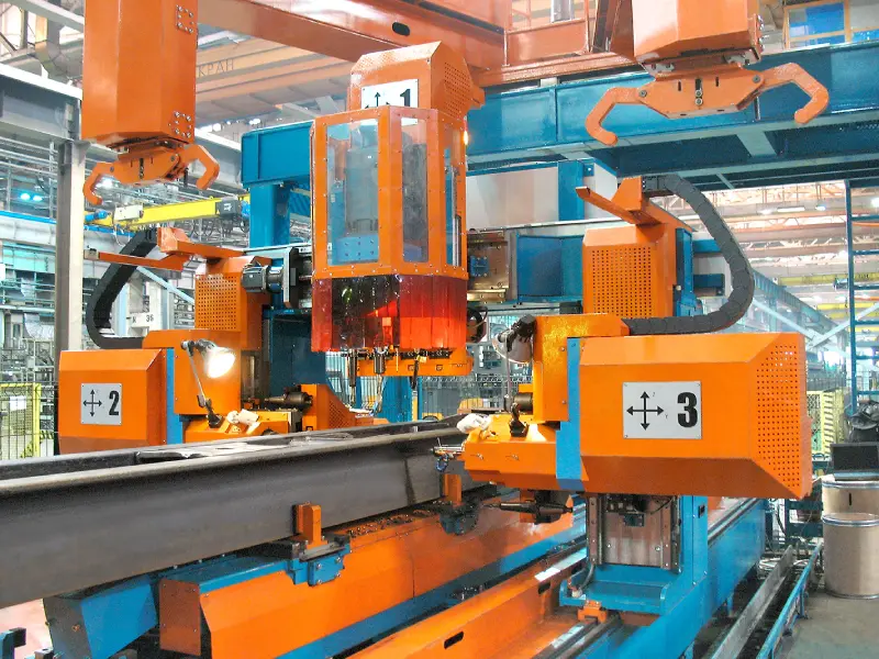Together, these three heads allow simultaneous machining from the top and both sides of the beam.