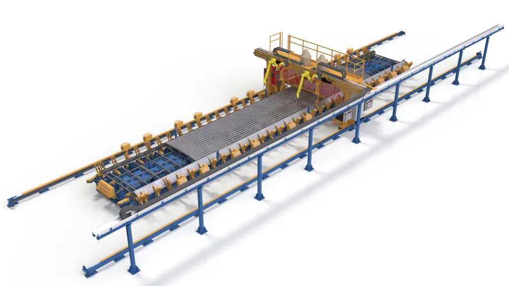 Основой комплекса является портал со сварочным роботом для MIG/MAG сварки, выполненный в форме П-образной конструкции. Этот портал обеспечивает плавное перемещение роботов в продольном и поперечном направлениях во время сварочных работ.